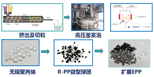 把特種處理的聚丙烯微晶顆粒,放入高壓(50大氣壓)和高溫(150℃)的高壓釜中,用CO2作為發(fā)泡劑浸漬,可以制備出發(fā)泡聚丙烯顆粒。