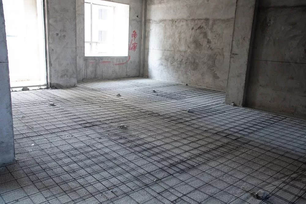 b.其次改性聚丙烯保溫隔聲板鋪設(shè)完畢后開始澆筑混凝土(澆筑混凝土保護(hù)層時(shí),應(yīng)及時(shí)修正鋼筋網(wǎng)片的位置。墻角處、穿樓板管道處澆筑混凝土?xí)r,不得將混凝土澆入豎向隔離片和墻體之間。),混凝土保護(hù)層中部應(yīng)配置鋼筋網(wǎng)片(鋼筋網(wǎng)片應(yīng)潔凈、無損傷,可在鋼鋼筋網(wǎng)片下面墊上墊塊,確保鋼筋網(wǎng)片置于混凝土保護(hù)層的中間位置,鋼筋綁扎時(shí),應(yīng)避免鐵絲頭刺破HKS改性聚丙烯保溫隔聲板和防水膠帶)。